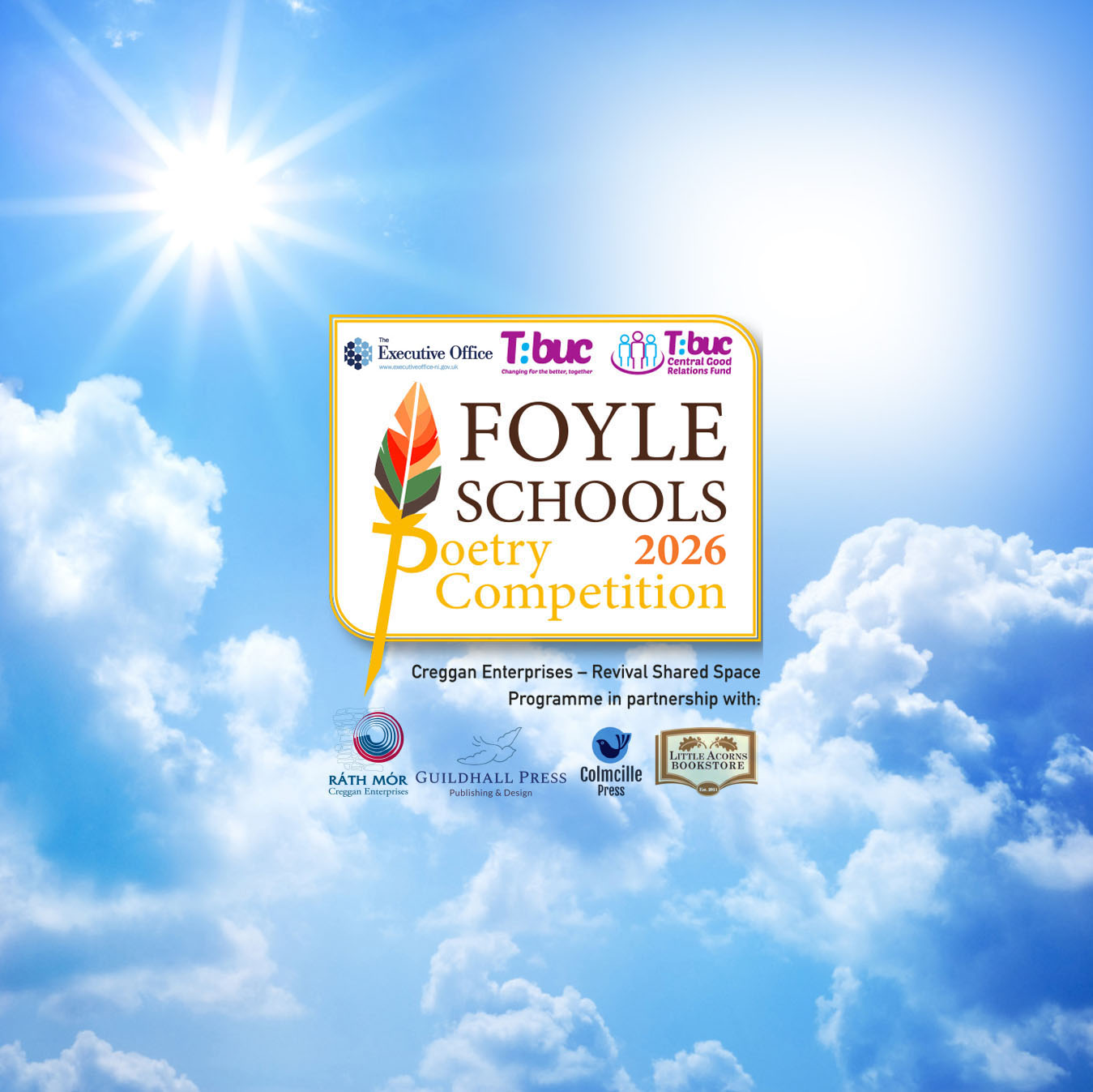 The Foyle Schools Poetry Competition (2026) is the result of an innovative partnership between Creggan Enterprises (Revival Shared Space Programme), Guildhall Press, Colmcille Press and Little Acorns Bookstore, funded by the Executive Office (under its Central Good Relations Programme) and is aimed at showcasing the creative literary talent of our district’s young people.
